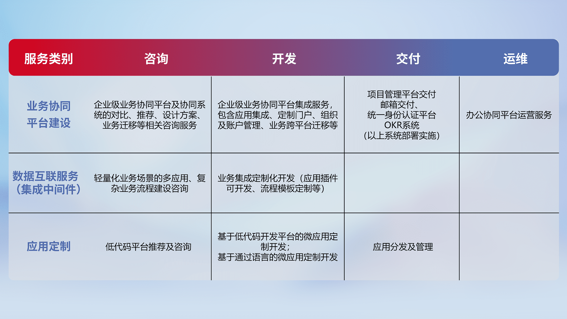 针对钉钉、、、、企微、、IDaas等平台级产品提供产品的规划、、、、方案、、交付、、、、定制化开发等服务,,,实现如统一协同办公、、、智能客户服务、、、混合会议管理、、智能数据查询、、、、等业务场景,,,实现数字化转型。。
